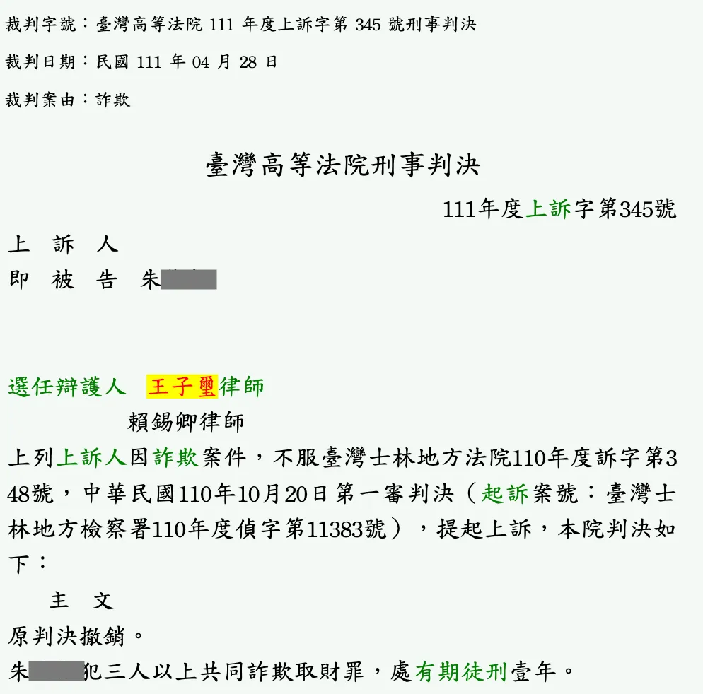 首頁 > 成功案例 > 刑事案件 > 刑事_朱○○_詐欺獲減刑成功